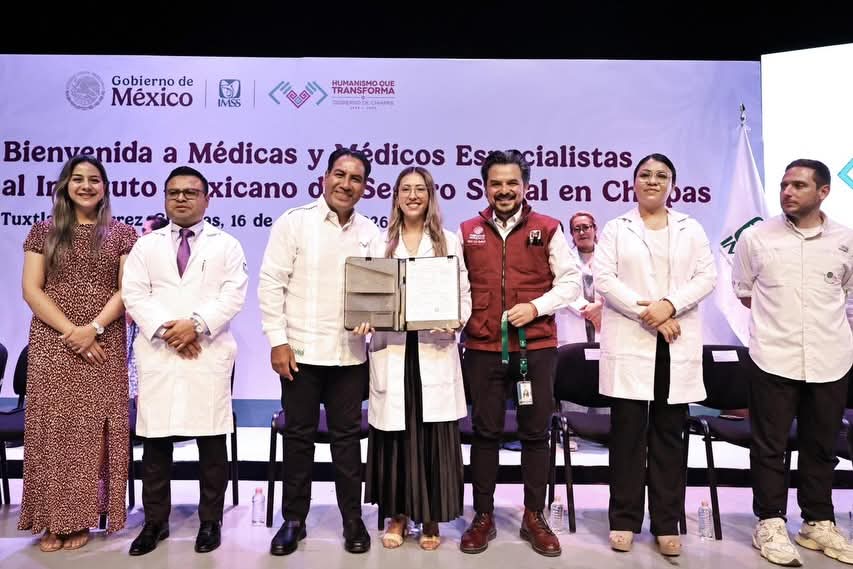 El gobernador de Chiapas, Eduardo Ramírez Aguilar, y el director general del Instituto Mexicano del Seguro Social (IMSS), Zoé Robledo, dieron la bienvenida a 371 médicos especialistas que se incorporan a laborar en hospitales de la institución en zonas urbanas y rurales, quienes fueron contratados en la jornada de reclutamiento 2026 para fortalecer la atención médica de alta especialidad en el estado.